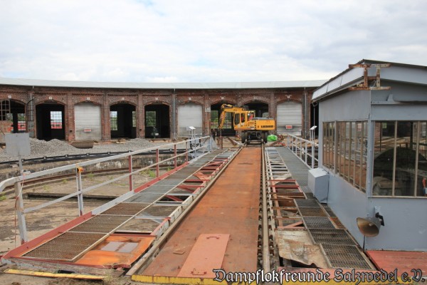 Die Arbeiten im und am Lokschuppen in Wittenberge schreiten weiter voran. Inzwischen wurde die Verputzung des Lokschuppens weiter vorangetrieben und die Gleisbereiche vom Schutt befreit. Nun können auch die elektrischen Ausrüstungen, die Lampen, sowie die Wasser- und Druckluftversorgung eingebaut werden.
