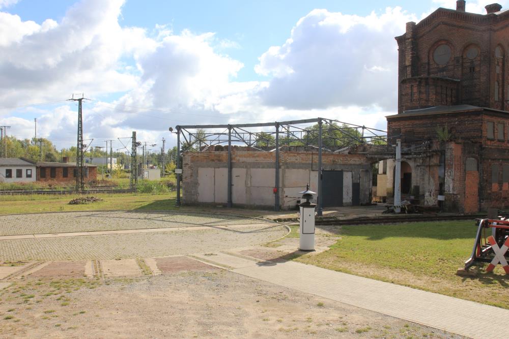 Wir befinden uns inzwischen auf dem Grundstück des ehemaligen Lokschuppens 1 des Bahnbetriebswerkes Wittenberge. Dabei handelte es sich um eine sogenannte Rotunde. Darunter versteht man einen runden, völlig geschlossenen Lokschuppen mit innenliegender Drehscheibe. Das Gebäude war sehr markant, weil es von einer riesigen Dachkuppel überspannt wurde. Diese Kuppel wurde in den 1980er Jahren durch einen Sturm zerstört. Das Gebäude selbst wurde Ende der 1990er Jahre abgerissen, weil Teile davon auf der Trasse der seinerzeit neu errichteten Gleisverbindung vom Bahnhof Wittenberge in Richtung Elbbrücke im Weg standen. Ein kleiner Teil steht noch in Fragmenten, weil er nachher noch als Pkw-Werkstatt und Garage genutzt wurde. Auf dem Plan erkennt man die ursprüngliche Anordnung der Gleise in diesem Gebäude. Die Lage der Drehscheibe ist heute noch durch einen kreisrunden Parkplatz zu erkennen.