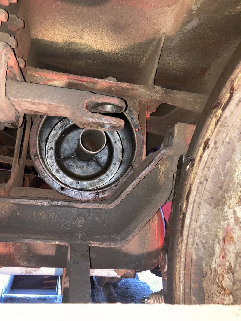 Auf dem folgenden Bild erkennt man den Bremskolben in eingebautem Zustand im Bremszylinder. Es fehlt noch die Kolbenstange, die in das dünne Rohr gesteckt wird, und die mit der Gabel im Vordergrund verbunden wird. Die runde Scheibe rechts im Bild ist übrigens die Innenseite eines Rades des Tenders.
