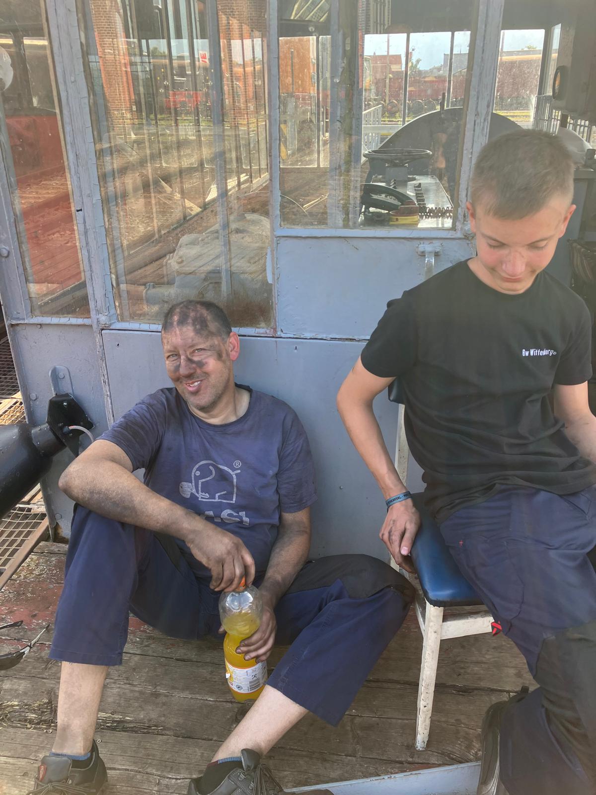 An diesem Wochenende haben wir Emma schon auf ihren nächsten Einsatz vorbereitet und alle Betriebsstoffe ergänzt. Außerdem haben mittels Druckluft die Kesselrohre von Staub und Ruß befreit, durch die die heiße Luft von der Feuerkiste in Richtung Rauchkammer strömt. Da lagern sich bei jedem Einsatz immer wieder Verbrennungsrückstände ab und behindern die Wärmeübertragung in den Kessel. Nach ihrer Behandlung macht sie bestimmt wieder viel Dampf.